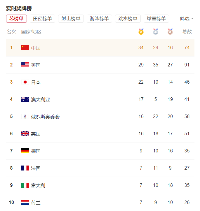 东京奥运会目前正火热进行中,截至8月6日16时,中国队夺下34枚金牌、24枚银牌、16枚铜牌,以74枚奖牌的总数暂列榜首!